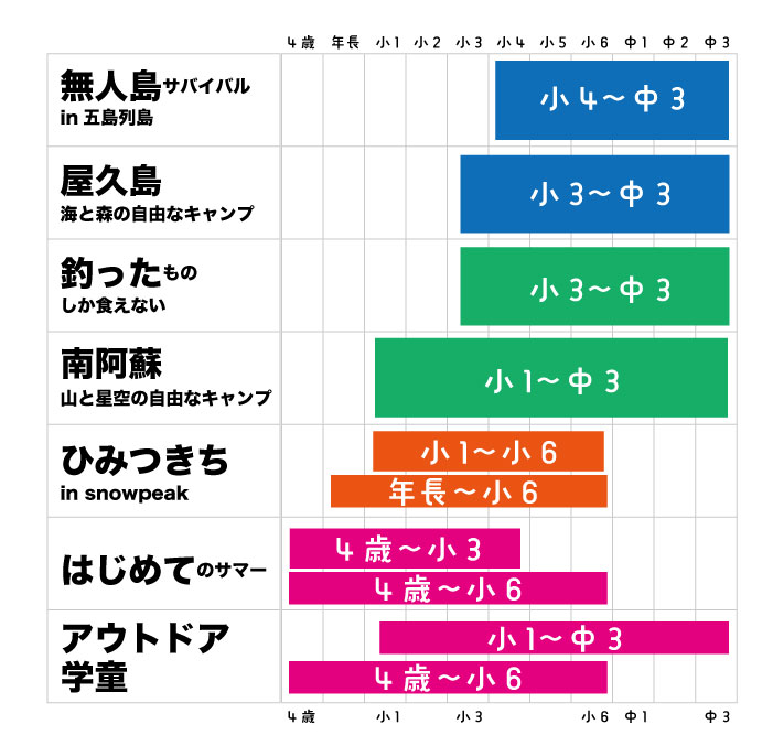 | アウトドア学童 ①8/5(水)〜 ②8/17(月)〜 日帰り×3日間 |