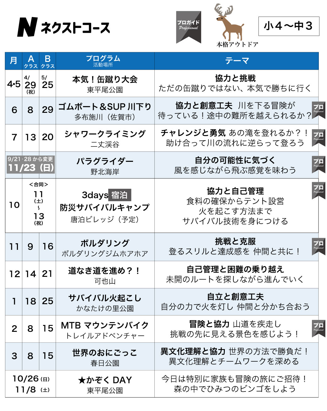 | 中止順延について | 以下のプログラムは、悪天候の場合は中止順延となります。 |